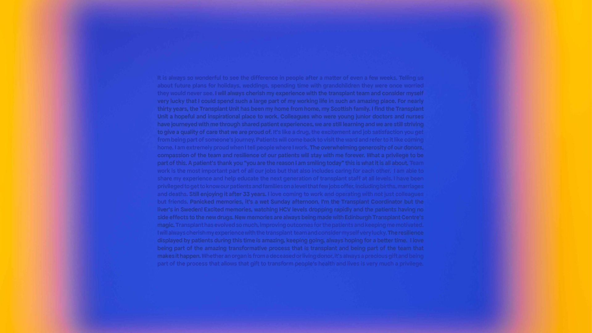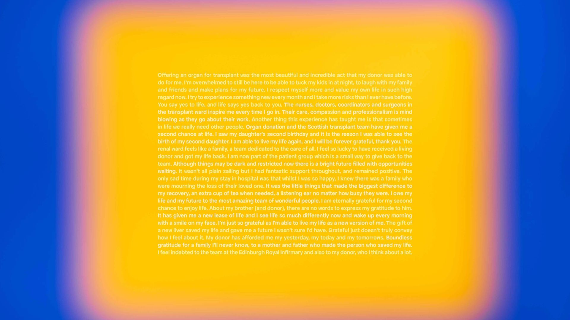 Installed at the entrance to the Renal Transplant Unit at the Royal Infirmary of Edinburgh, a striking new artwork now greets patients, families and staff with warmth and welcome. Each panel glows softly with the words of those whose lives have been touched by transplant care.
